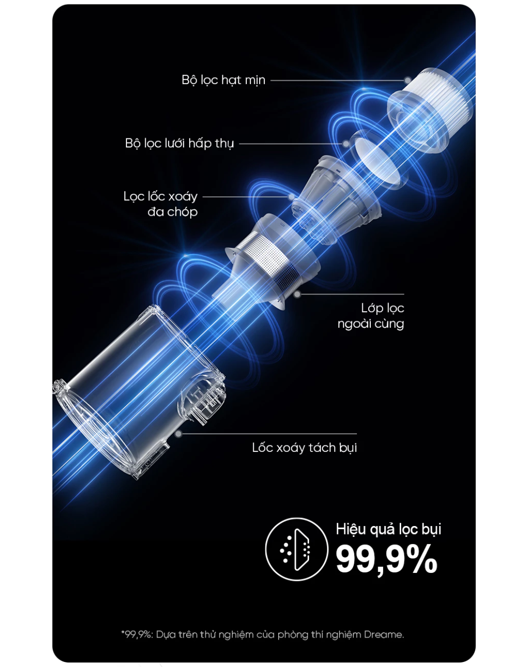 Máy hút bụi không dây thông minh Dreame V12S được trang bị hệ thống lọc nhiều lớp có khả năng giữ lại đến 99,9% bụi mịn và các hạt nhỏ li ti, giúp không khí trong nhà luôn trong lành và sạch sẽ. Bộ lọc có thể tháo rời, vệ sinh và tái sử dụng dễ dàng, tiết kiệm chi phí và thân thiện với môi trường.