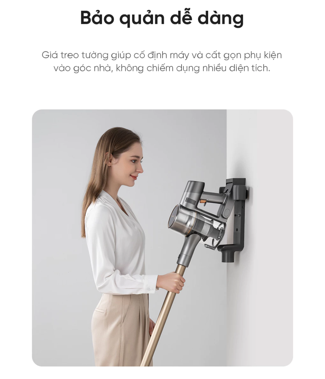 Ngoài khả năng làm sạch ấn tượng, Dreame V12S còn sở hữu thiết kế hiện đại với giá treo tường thông minh, giúp cất gọn máy và phụ kiện sau khi sử dụng. Nhờ vậy, không gian nhà bạn luôn gọn gàng, sang trọng và hiện đại hơn.