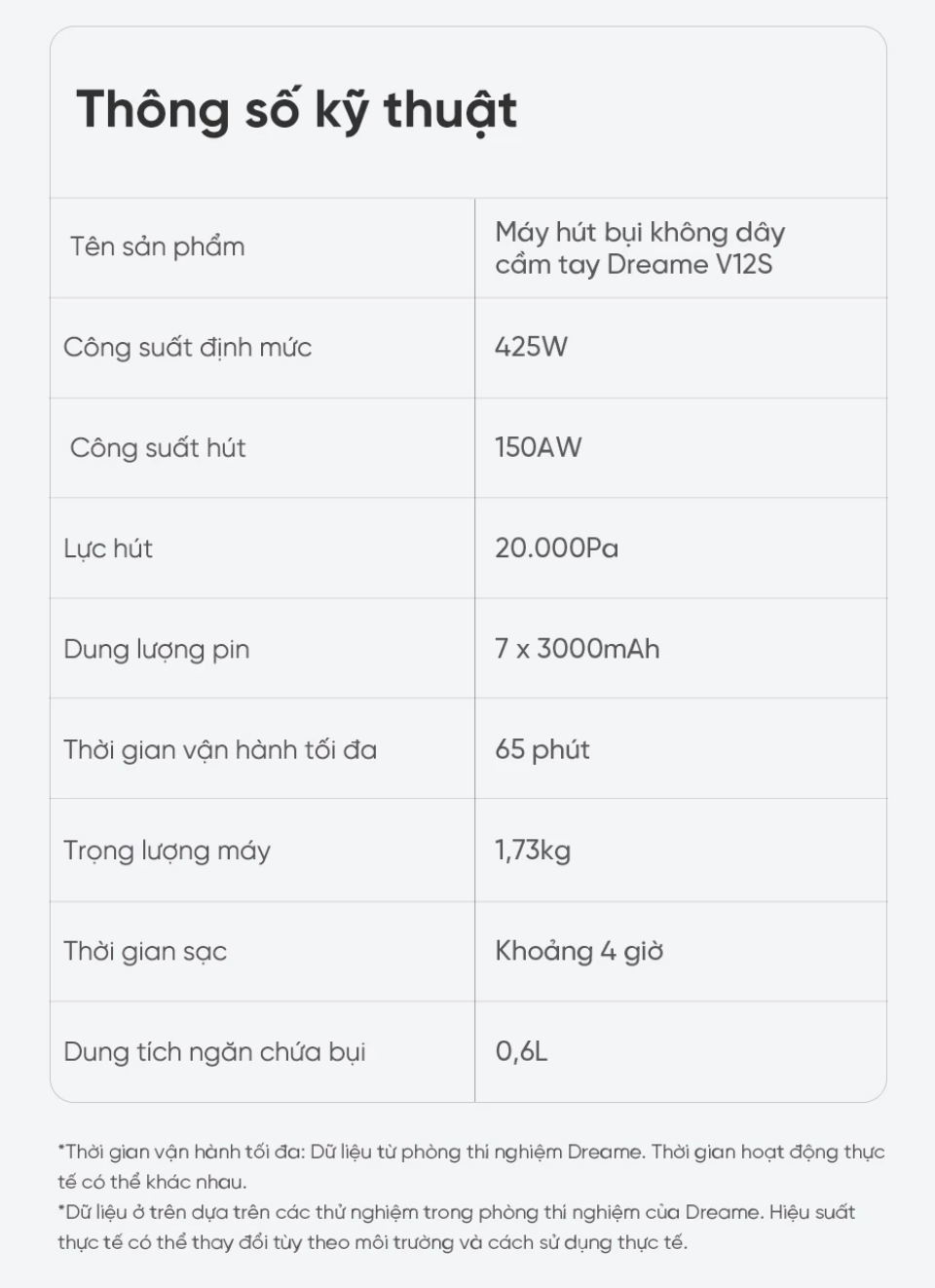 Thông số kỹ thuật Dreame V12S: