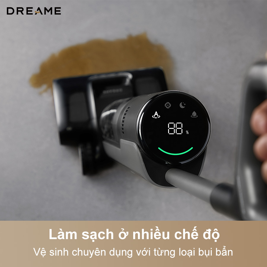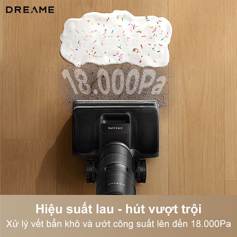 Dreame H12 Flexreach sở hữu lục hút 18.000 Pa cùng cuộn lăn quay 480 vòng/phút, giúp đánh bay, bụi mịn, lông thú và cả vết bẩn cứng đầu. Công nghệ lau sàn bằng nước sạch tốc độ cao giữ cho mặt sàn luôn khô ráo, không để lại vệt, an toàn cho nhiều chất liệu sàn như gỗ công nghiệp, gạch men, đá marble.