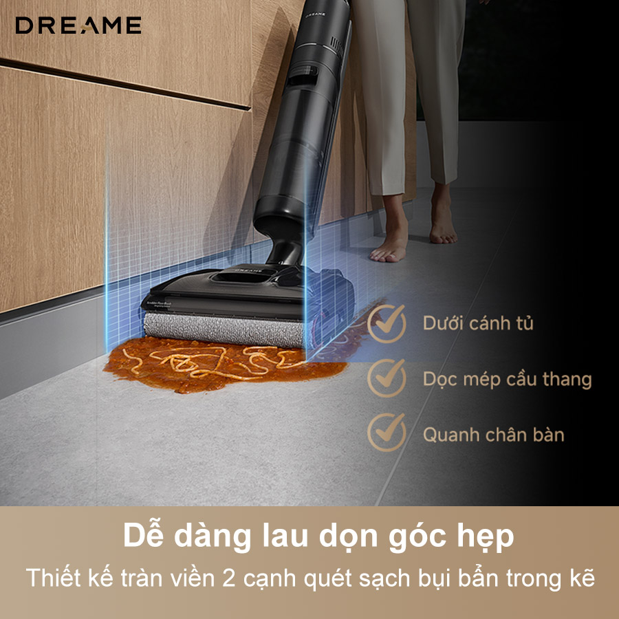Điểm khác biệt của máy hút bụi lau nhà cầm tay Dreame H12 Flexreach nằm ở thiết kế tràn viền hai cạnh, cho phép máy tiếp cận sát chân tường, khe hẹp hay các “điểm mù” mà những dong máy truyền thống thường bỏ sót
