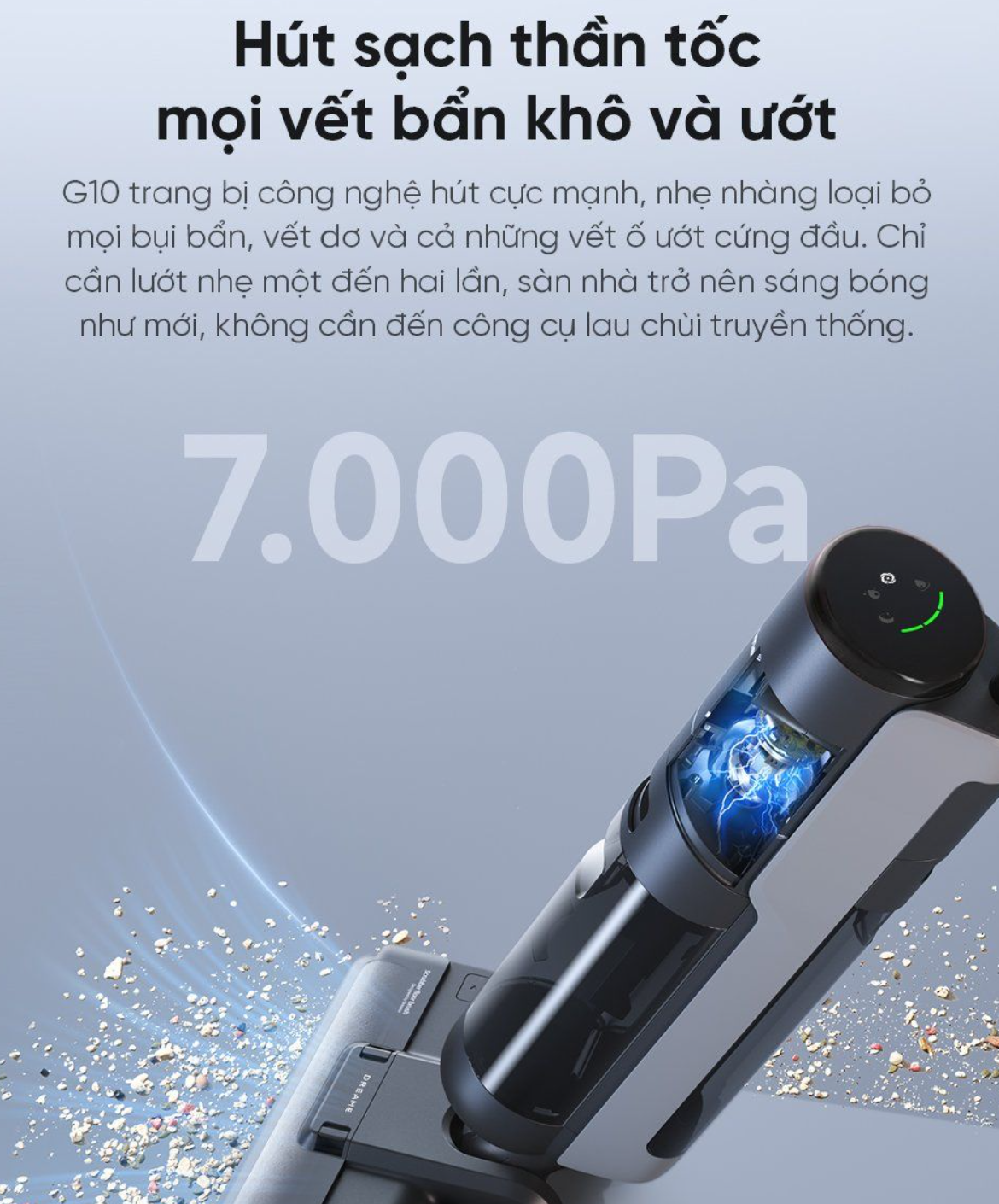 Dreame G10 được trang bị lực hút mạnh mẽ 7000 Pa kết hợp hệ thống dẫn nước thông minh, cho phép xử lý hiệu quả cả bụi mịn, vụn thức ăn, chất lỏng, bùn đất. Chỉ với 1 đến 2 lần lướt nhẹ, bề mặt sàn trở nên sạch sáng và khô ráo mà không để lại vệt nước.