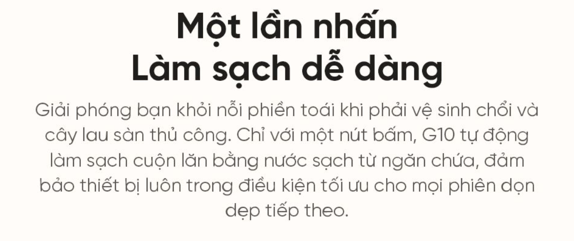Dreame G10 là lựa chọn hoàn hảo cho những gia đình muốn tối ưu thời gian dọn dẹp mà vẫn đảm bảo sàn nhà luôn sạch sẽ, sáng bóng. Với lực hút mạnh, khả năng lau sàn bằng nước sạch, chế độ tự làm sạch và làm việc linh hoạt, sản phẩm mang đến trải nghiệm dọn dẹp hiệu quả và tiện lợi vượt trội.