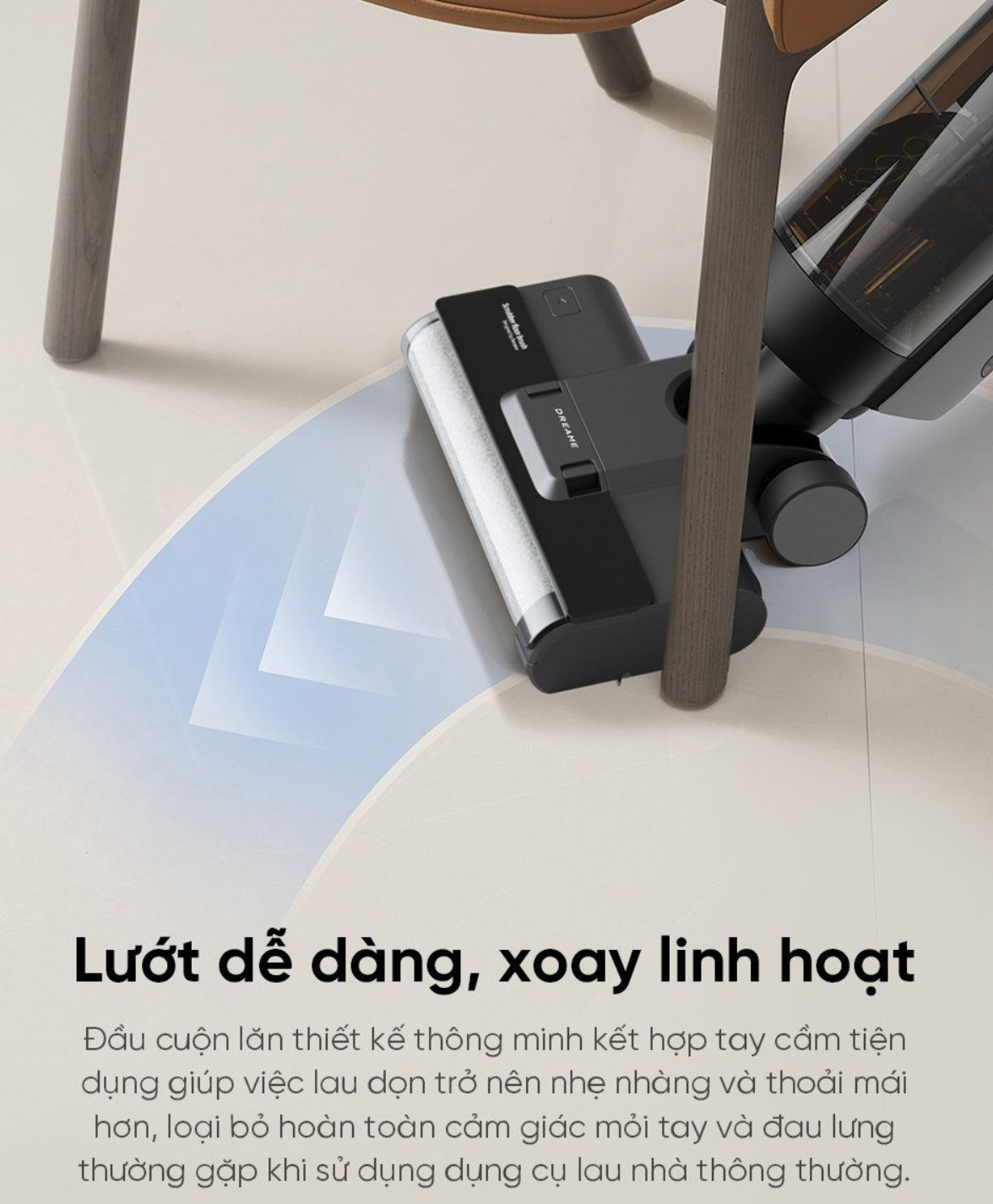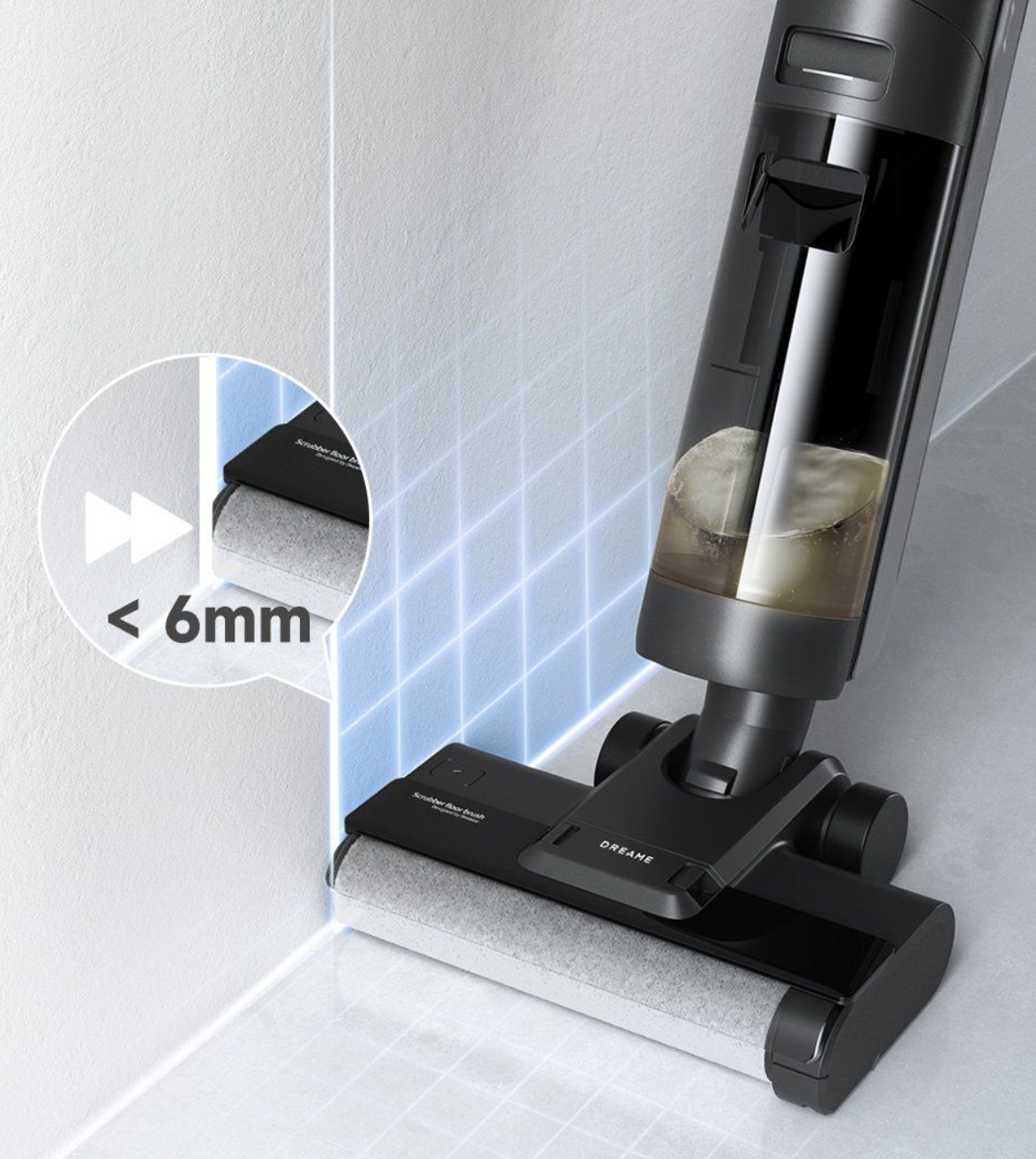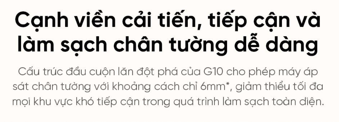Một trong những điểm nổi bật nhất của Dreame G10 là khả năng làm sạch sát chân tường chỉ với khoảng cách 6 mm. Thiết kế đầu cuộn lăn tối ưu giúp máy áp sát vào những vị trí khó tiếp cận như chân tường, góc tủ, cạnh ghế. Nhờ đó, bạn không cần dùng thêm chổi hoặc khăn lau để xử lý các khu vực mà robot hoặc máy hút bụi truyền thống thường bỏ sót.