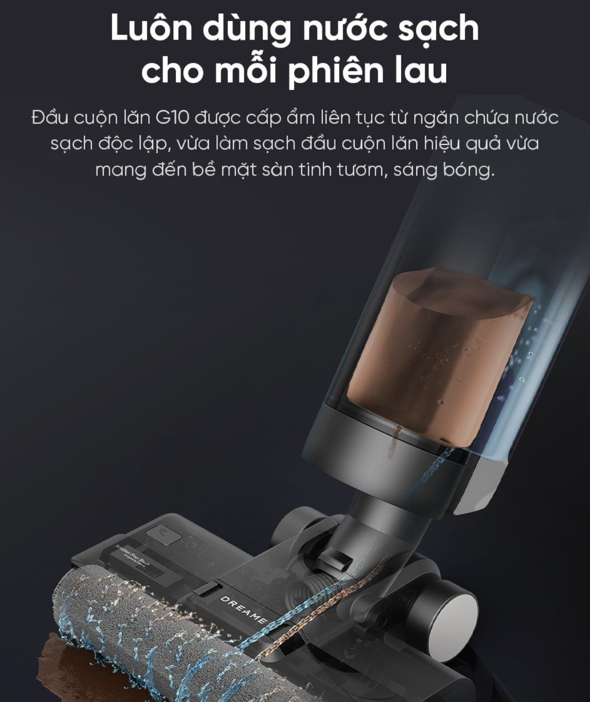 Với bộ cuộn lăn luôn được giữ ẩm bằng nước sạch, Dreame G10 mang đến cảm giác sàn nhà tinh tươm như mới lau.