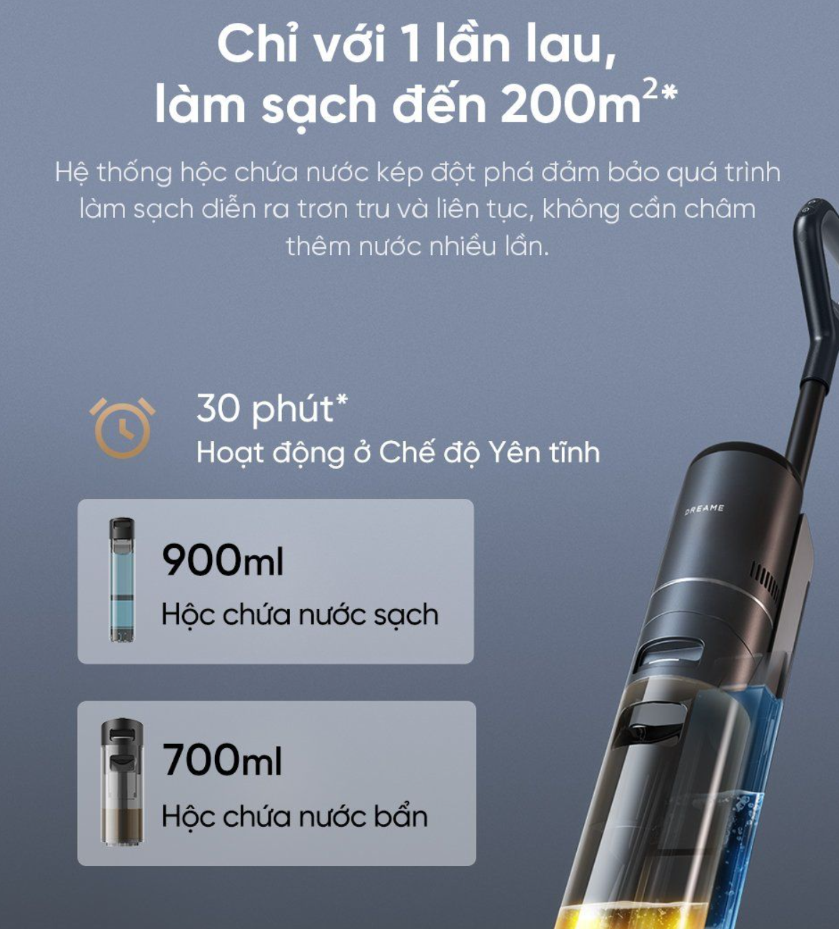 Với hộc nước sạch 900 ml và hộc nước bẩn 700 ml, Dreame G10 có thể làm sạch diện tích lên đến 200 m2 trong một lần lau. Thiết kế hộc nước kép cũng giúp phân tách hoàn toàn nước sạch và nước bẩn, đảm bảo sàn luôn được lau bằng nước mới.