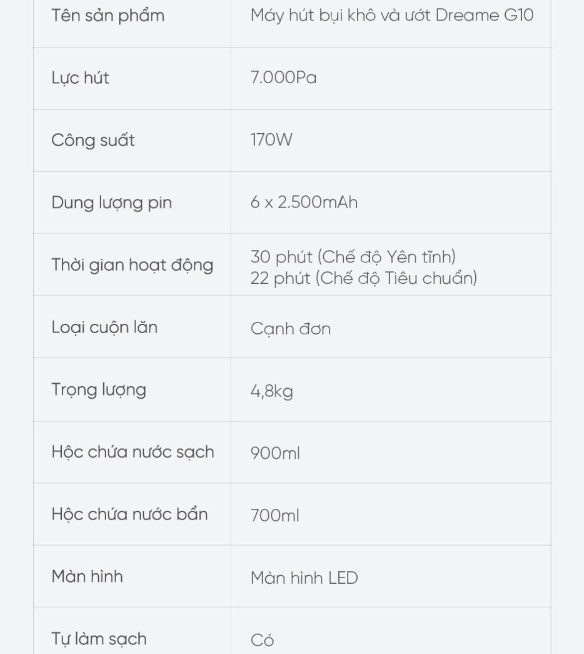 Thông Số Kỹ Thuật Máy Hút Bụi Lau Sàn Dreame G10