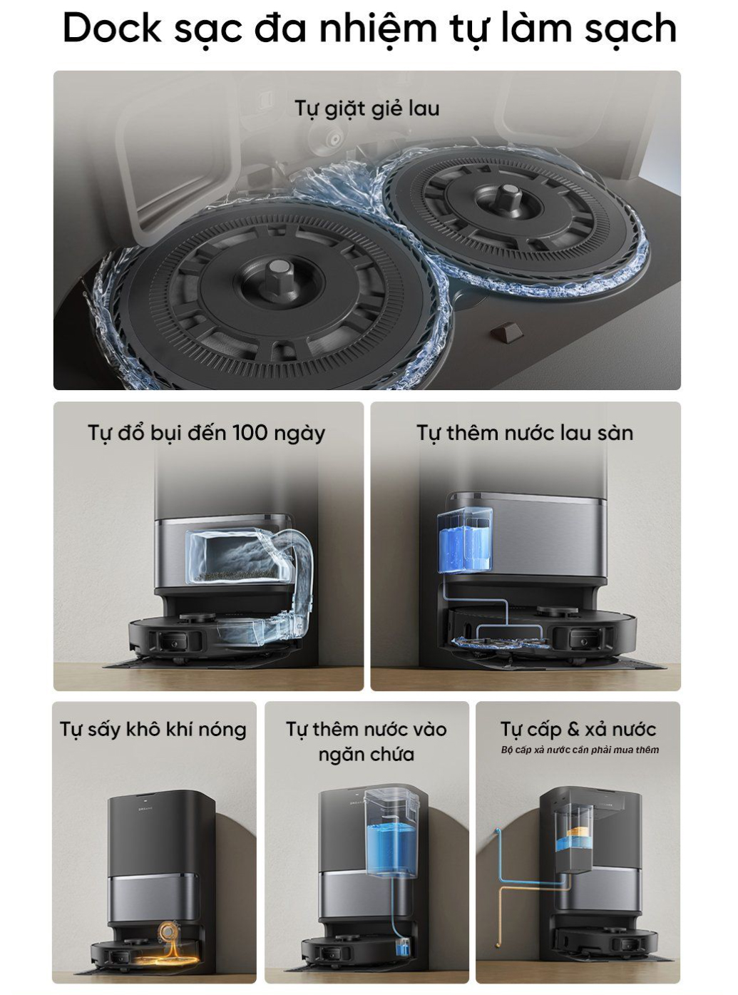 Khi robot giặt khăn lau, 20 đầu phun nước áp lực cao tự động xả và chà sạch khay giặt phẳng, đồng thời hút và xả nước bẩn ra ngoài – giúp dock luôn sạch, không lo cặn bẩn hay mùi khó chịu.